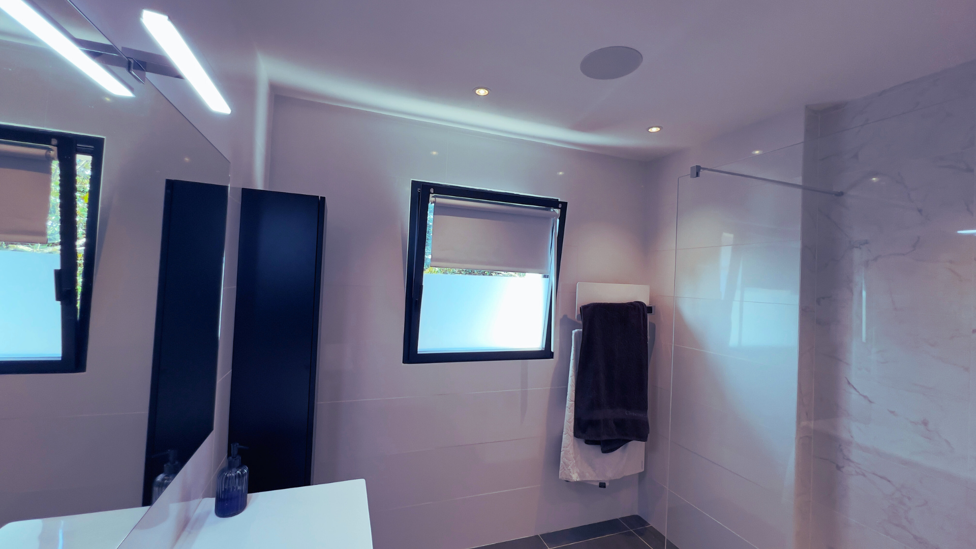 Ce confort des occupants est renforcé par une régulation climatique intelligente via un système gainable piloté en Modbus, couplé à la mesure continue de la température, de l’humidité et du CO₂. L’ombrage est automatisé pour optimiser la température intérieure selon la position du soleil, tandis que la sécurité repose sur un ensemble complet de capteurs et un système d’alarme utilisant éclairage, audio et notifications. Le mode nuit simplifie la fin de journée en gérant lumières, volets et interphone de façon automatique et sécurisée.
